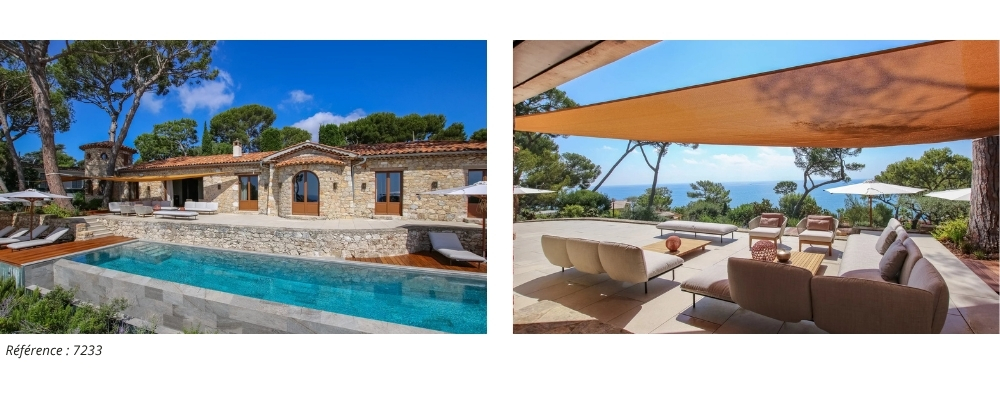 Listing 7233: In the heart of Cap d’Antibes, this stone country house of approximately 360 m², designed by a renowned architect, offers a rare and unspoiled living environment. Nestled within a wooded 3,050 m² estate, it captivates with its elegant outdoor spaces: a shaded terrace, reception areas, and a 14-meter infinity pool with panoramic views. The 280 m² main house features a bright living area with 4 en-suite bedrooms, complemented by a separate 80 m² guest house with 3 en-suite bedrooms.