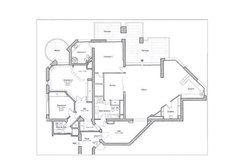 The apartment comprises an elegant entrance hall leading to a very spacious living room, extended by a large modern kitchen open onto the living area. The sleeping area includes two large bedrooms with walk-in closets and built-in storage, two shower rooms, an additional bedroom, one bathroom, as well as a study.