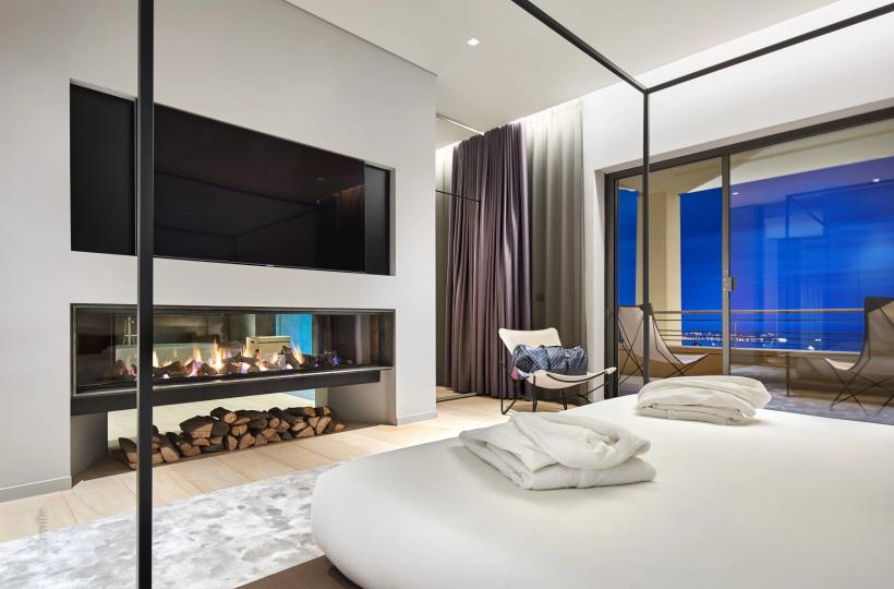 - A living room with fireplace and office, all open onto a large covered terrace with a magnificent sea view