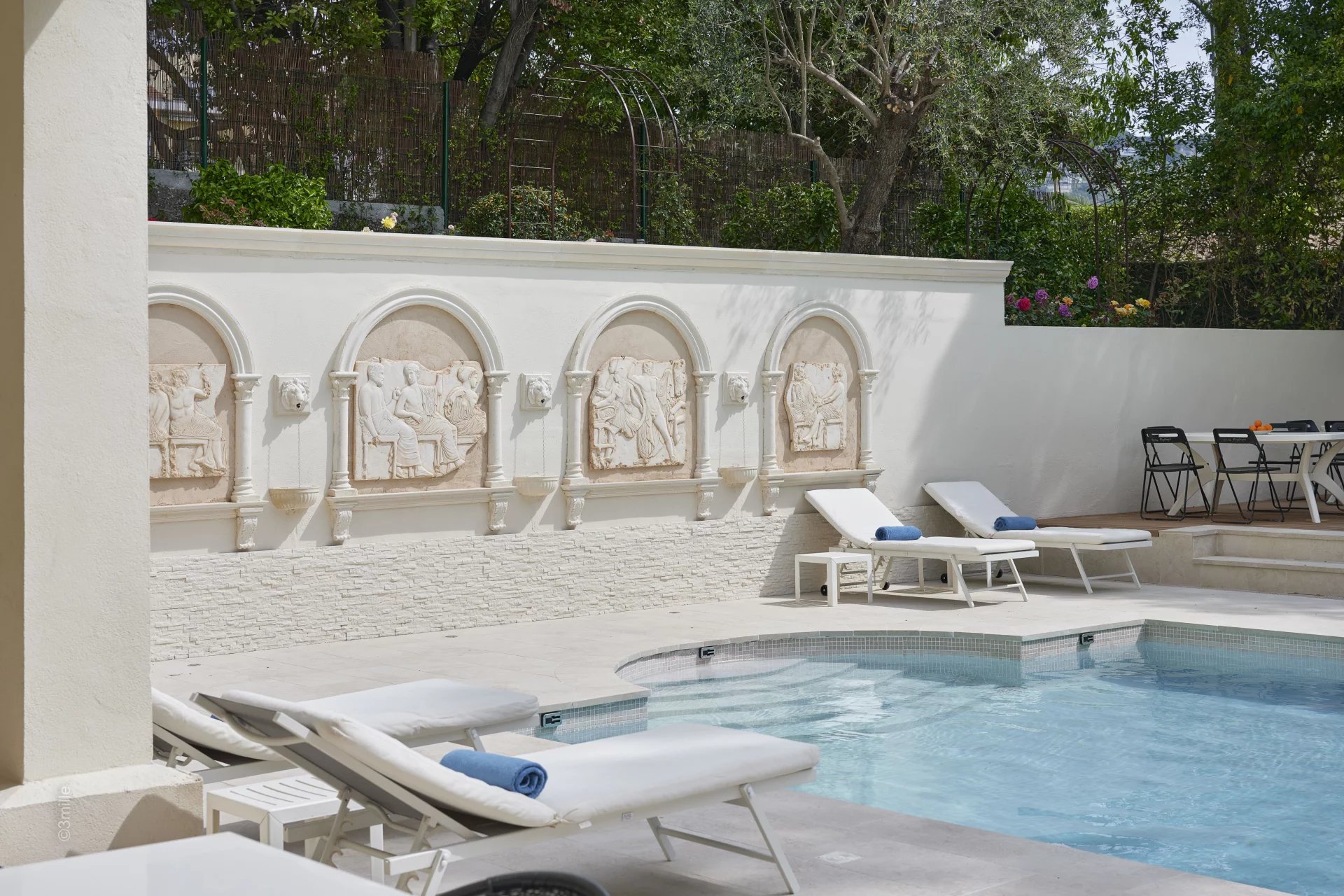 3 en-suite bedrooms, open to the terrace. Pool house with kitchen and shower room, a fitness room. Swimming pool.
