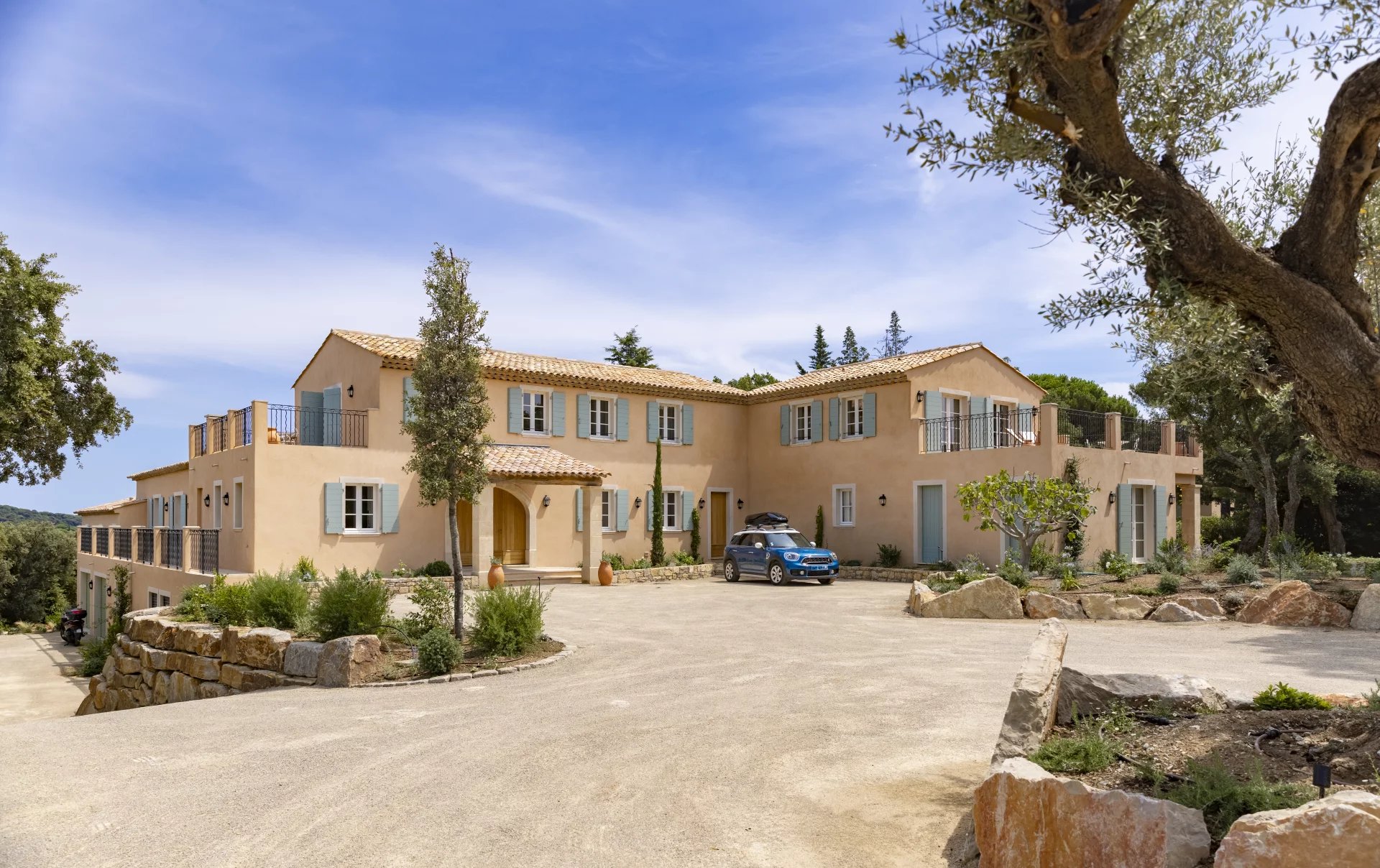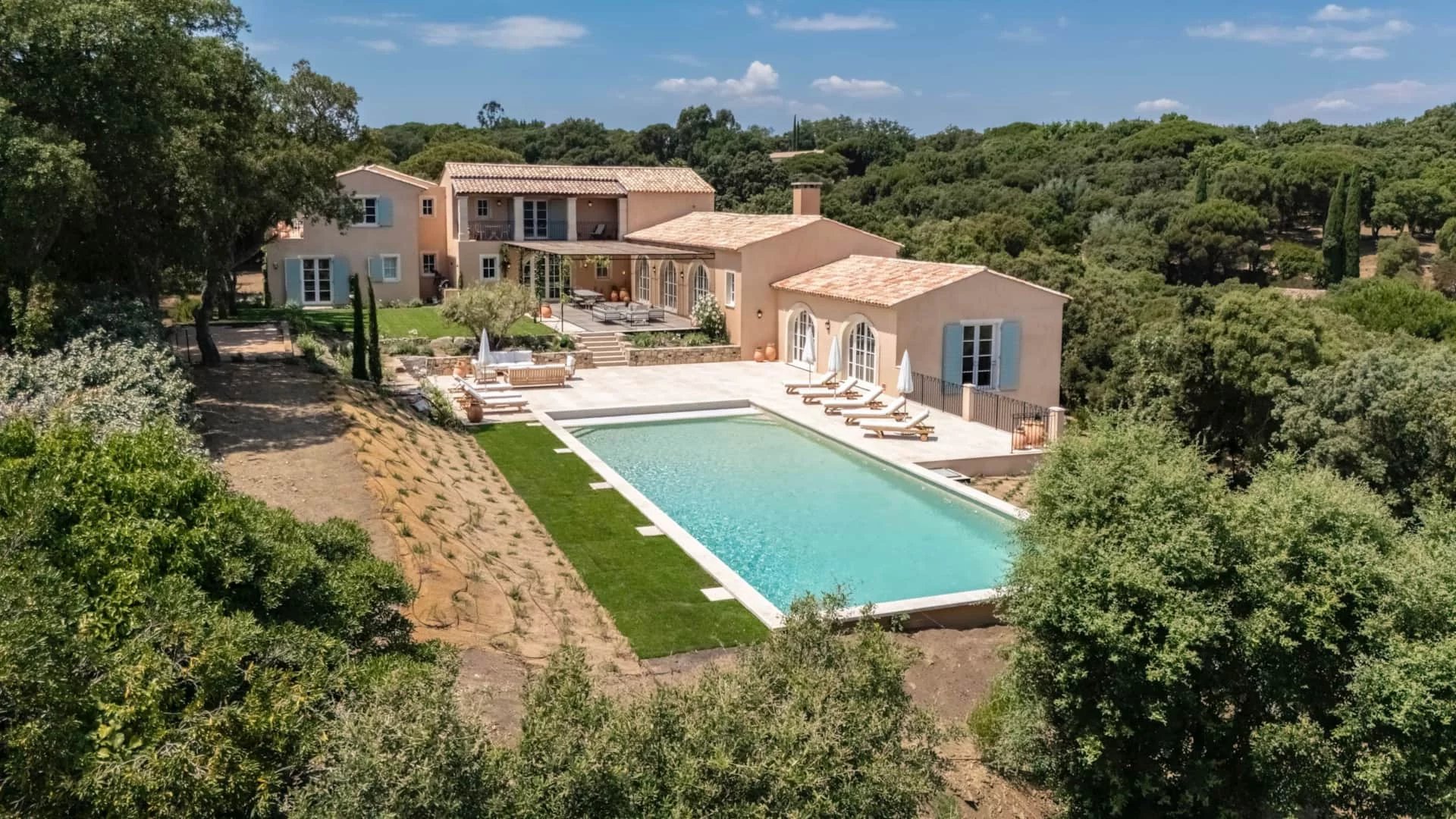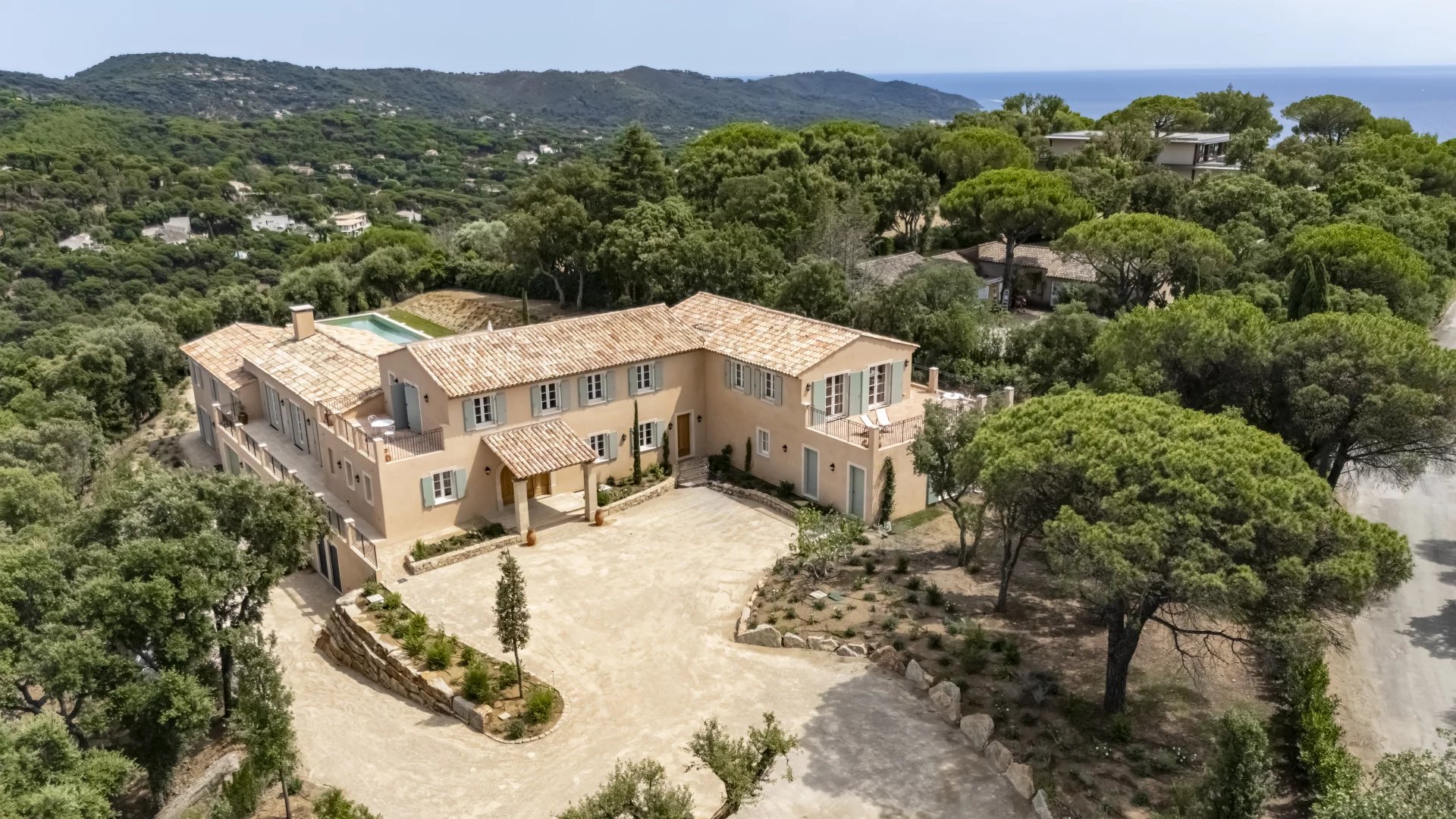 With an area of 640 m², it comprises 7 bedrooms and 7 bathrooms (a main villa and two bedrooms with independent access, accommodating up to 14 people) with garden views, a private heated pool, fire pit, pool house, gym, massage room, professional kitchen, garden, shaded parking, and private access to Sylvabelle beach.