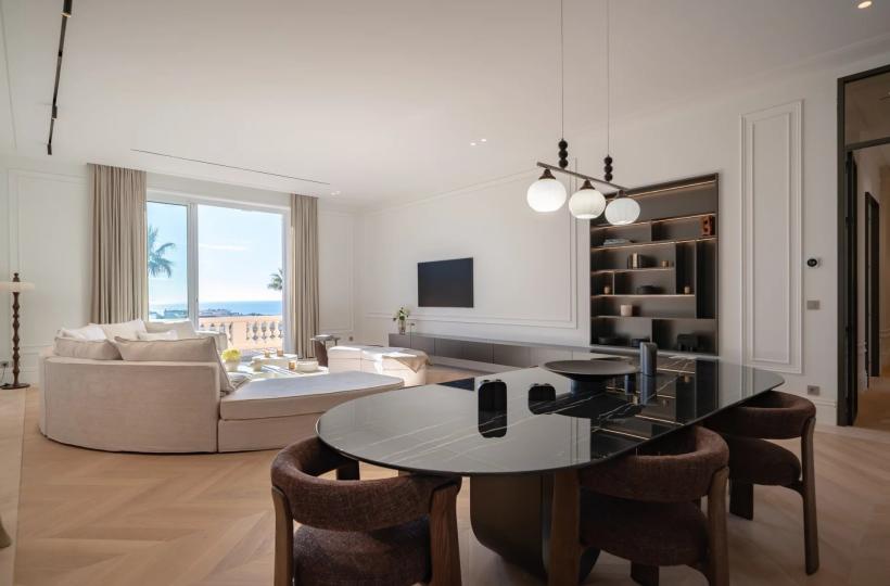 A majestic entrance hall leads to a spacious living and dining area with a semi-open kitchen, spanning approximately 65 sqm, and opening onto a balcony with a stunning unobstructed view over Cannes.