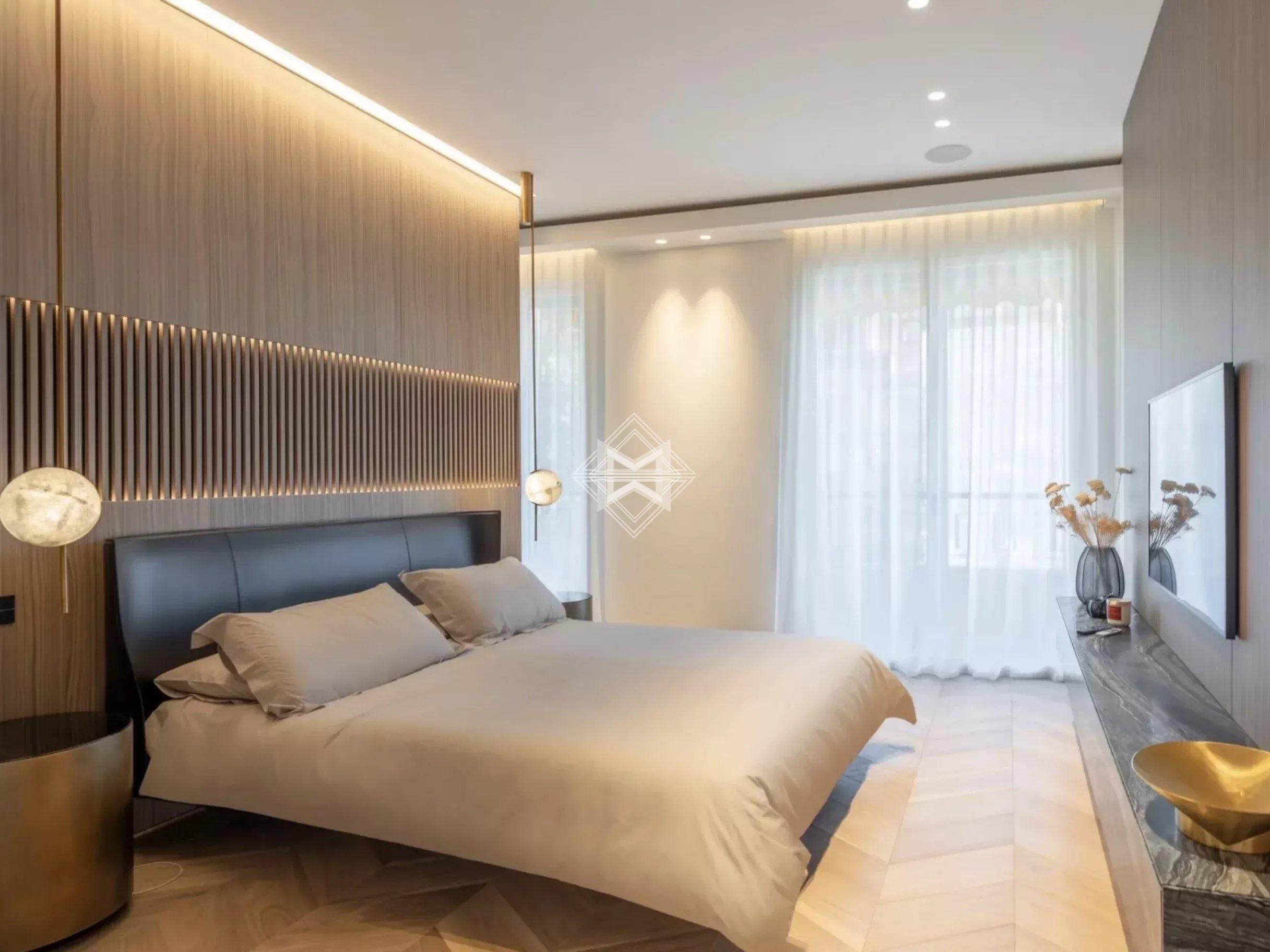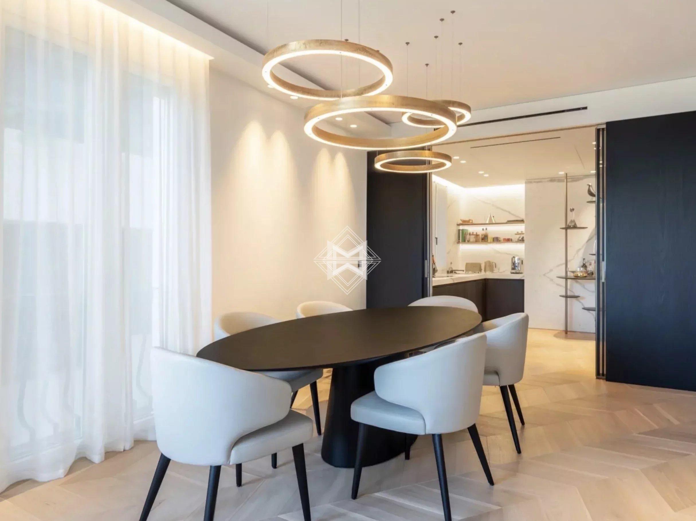 The large living room, flooded with natural light, stands out for its generous volumes. It opens onto a balcony with open views, allowing one to fully enjoy the prestigious urban setting of Monte-Carlo.