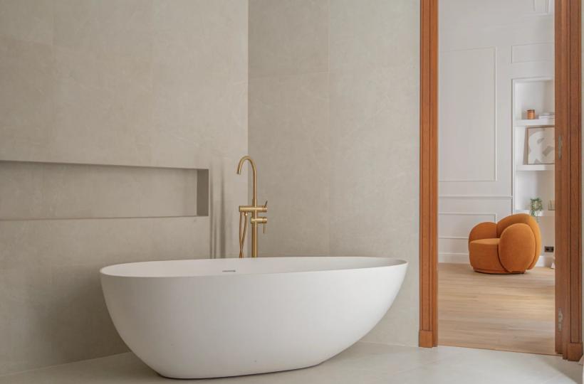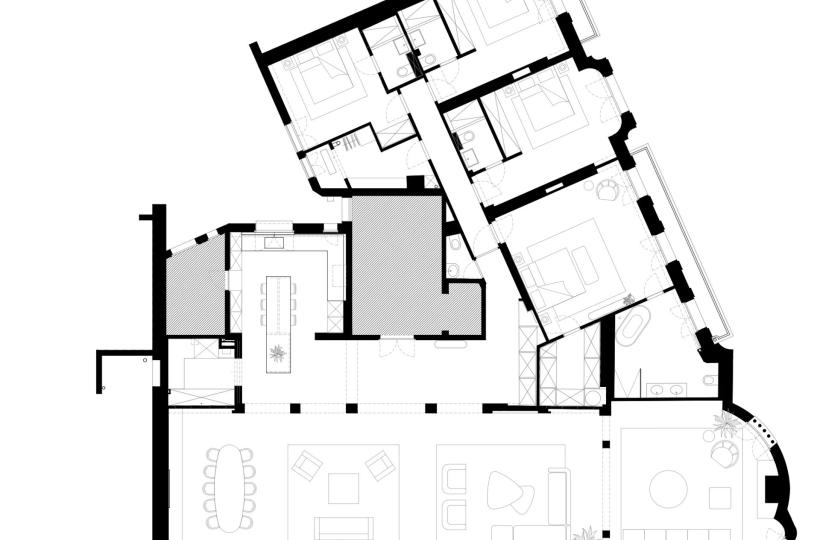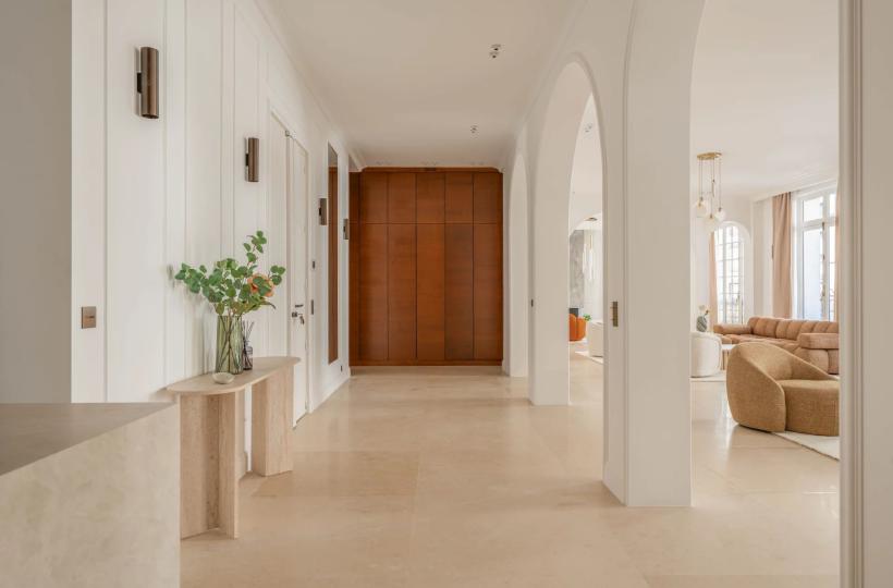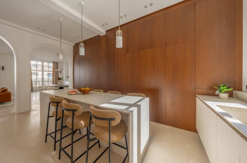 It opens onto a reception room of nearly 140 sqm, extended by a continuous balcony. Bathed in light and enhanced by a beautiful ceiling height, this space is the heart of the apartment.