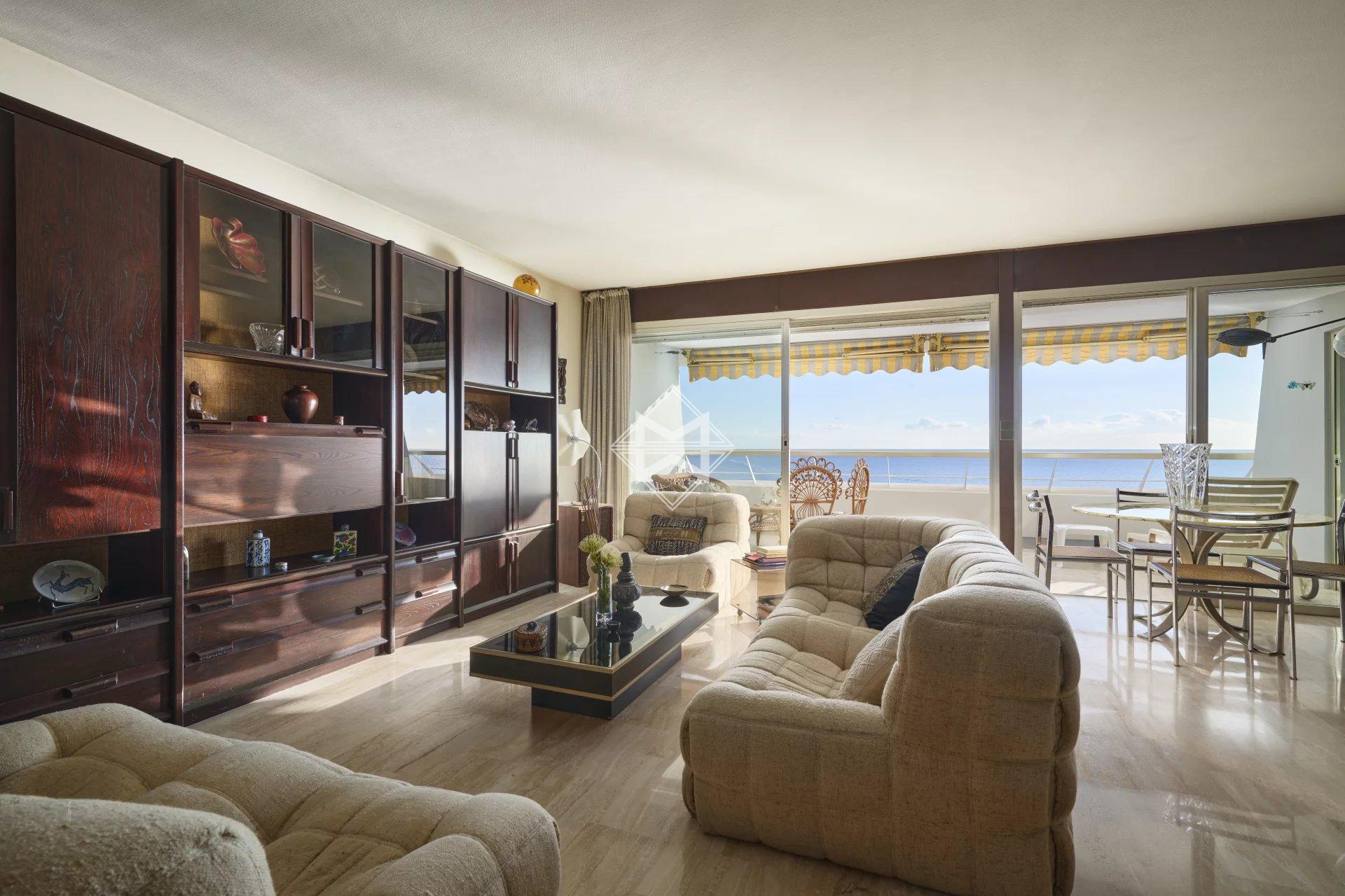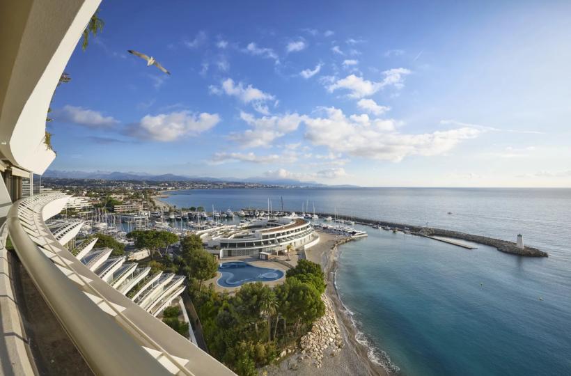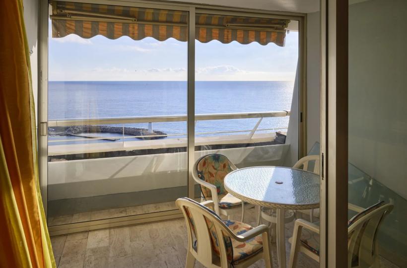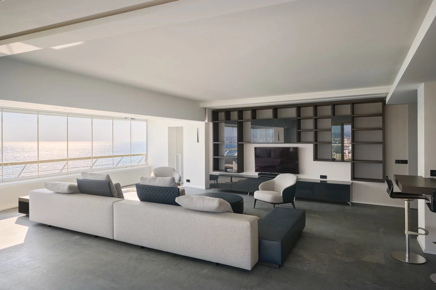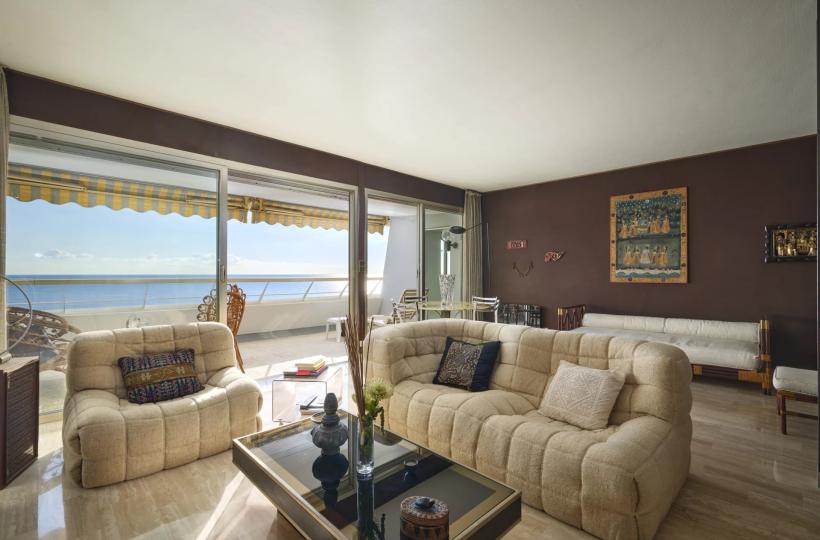On the upper floor, accessible by elevator, this 91 m² apartment enjoys breathtaking panoramic sea views stretching from Cap Ferrat to Cap d'Antibes, as well as views of the Marina.