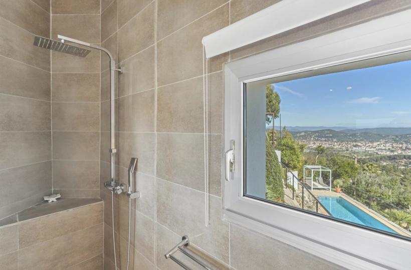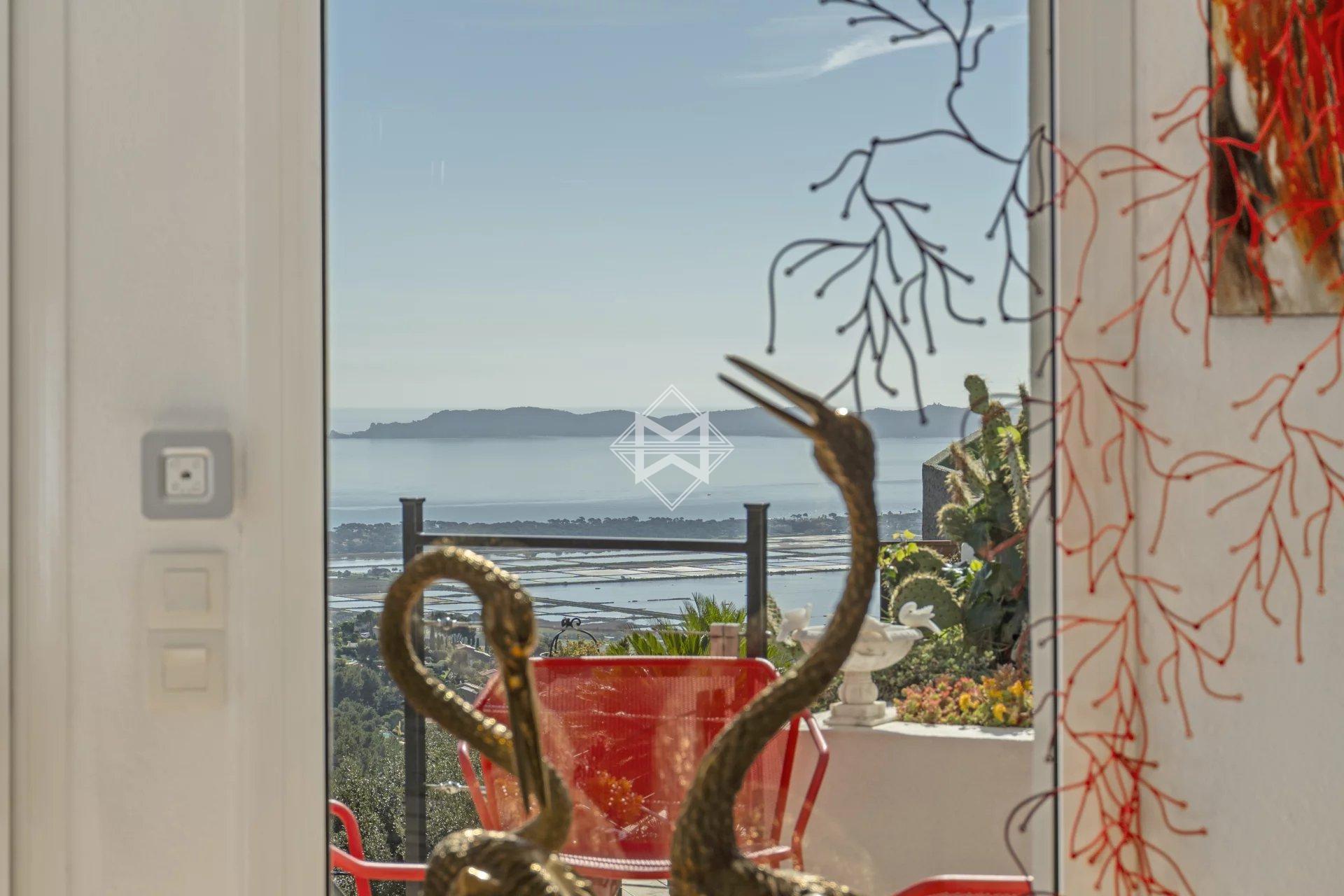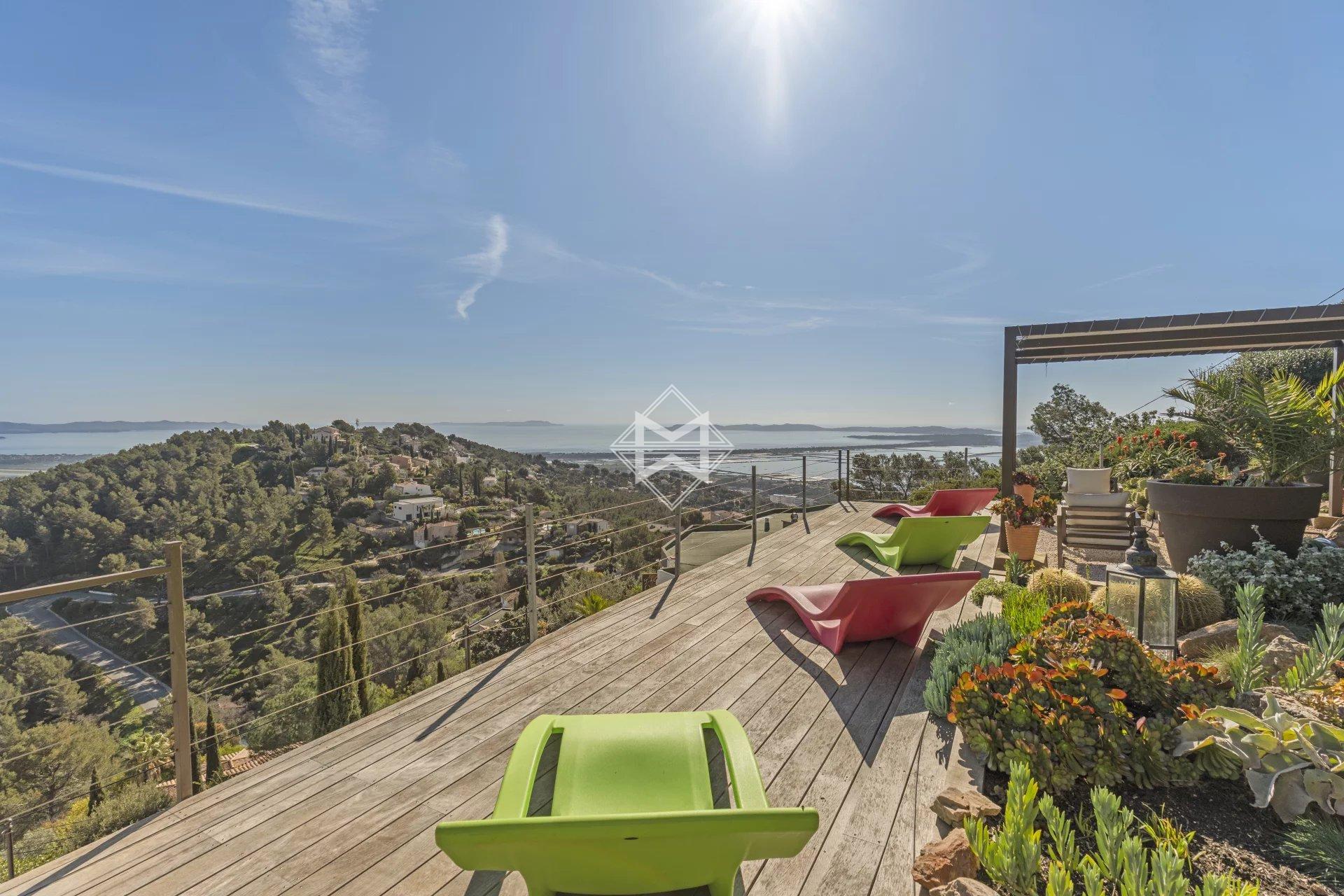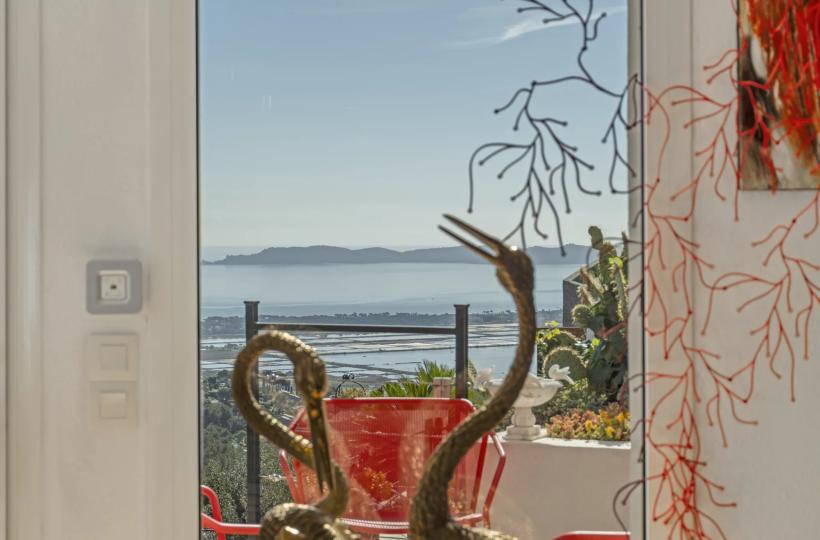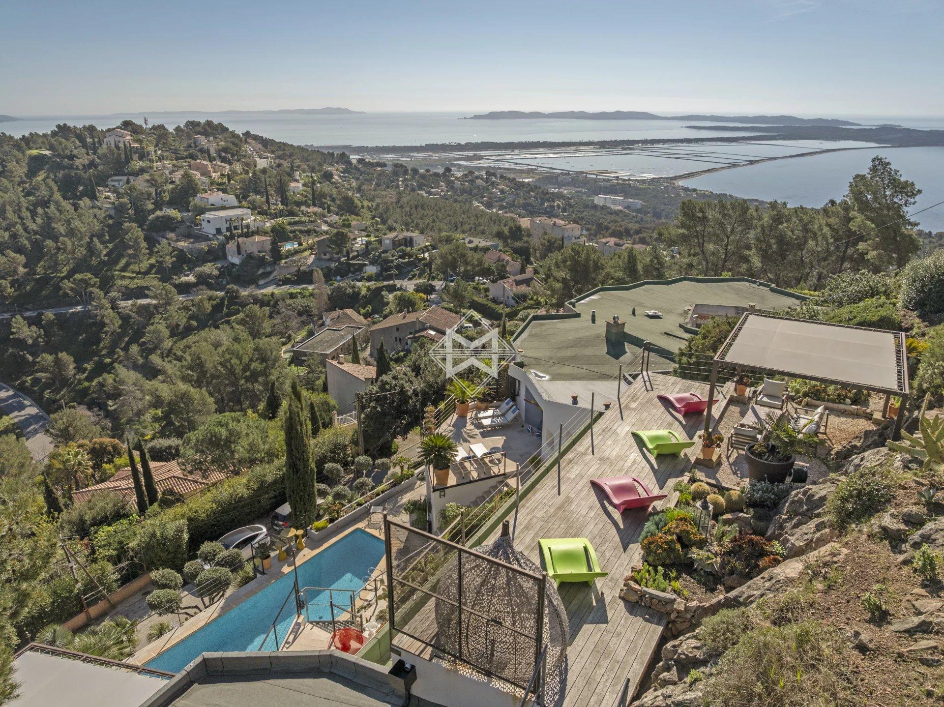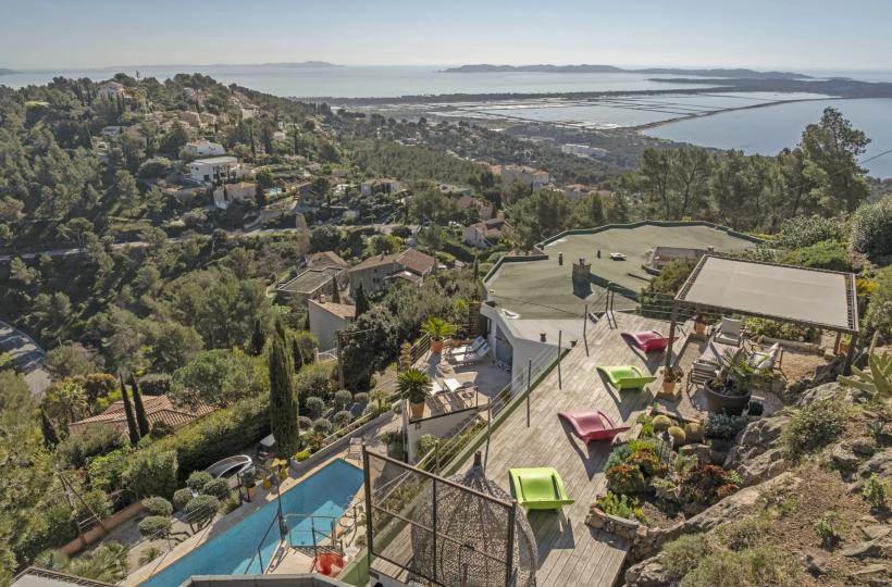 Outside, the swimming pool blends harmoniously into the landscape, while the solarium, a true lookout point, reveals one of the most spectacular views of Hyères.