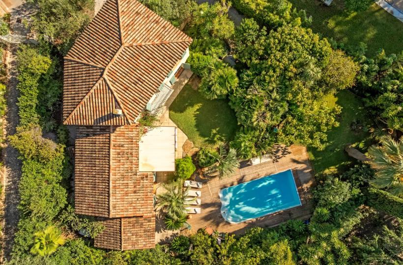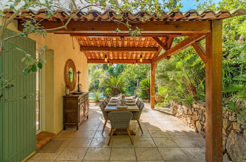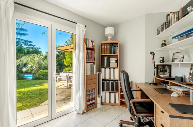Outside, two covered terraces, a swimming pool, a pergola, and a flat landscaped garden with automatic watering and shaded corners create a true haven of peace. The property is sheltered from the wind and secured with an alarm system, ensuring privacy and serenity throughout the year.
