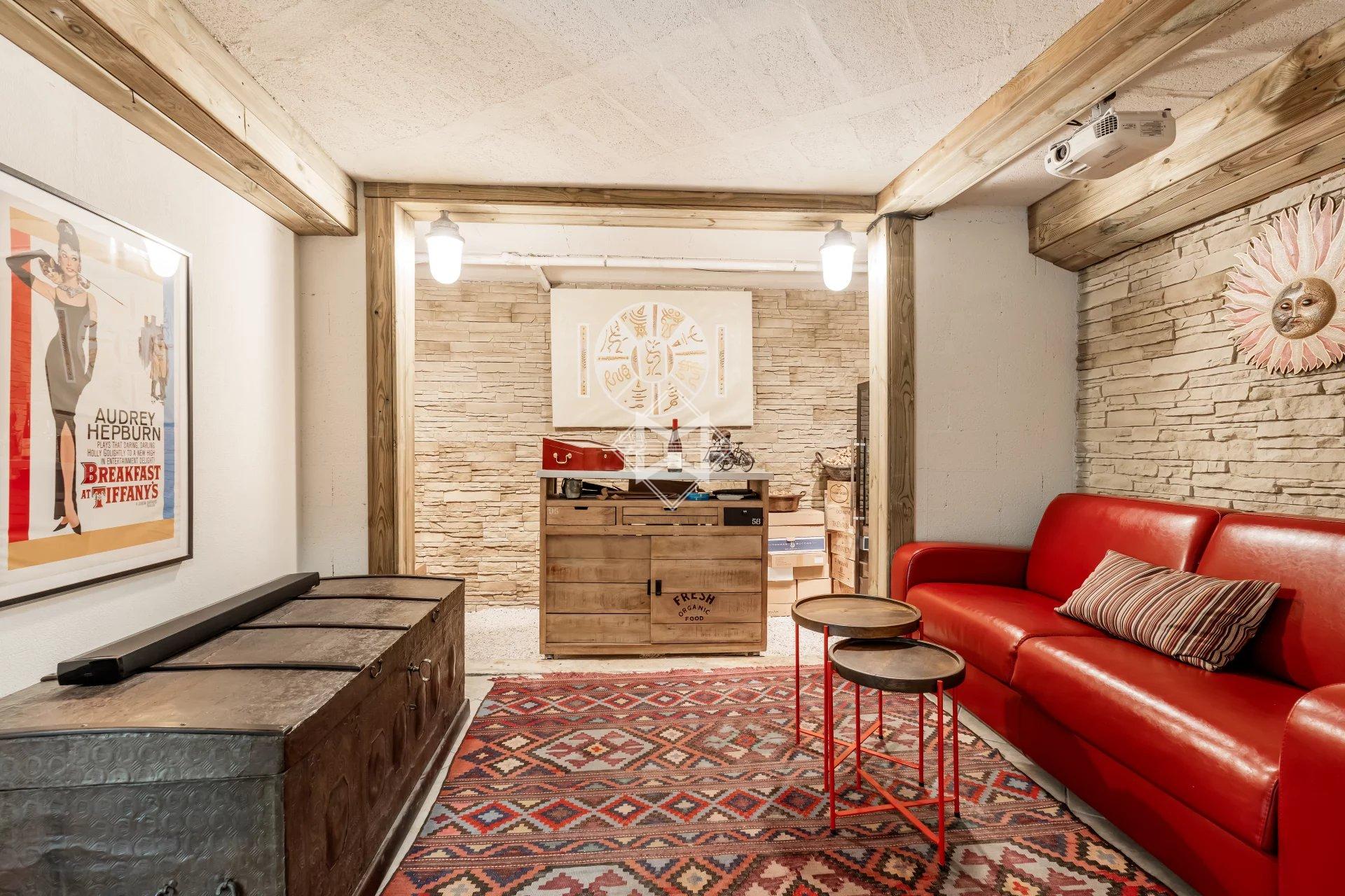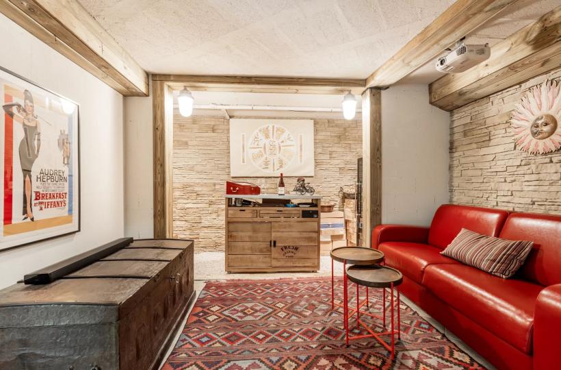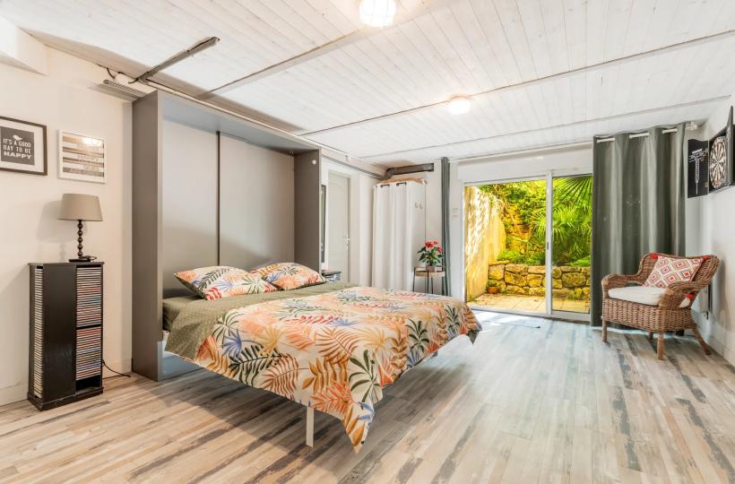 The garden level hosts an independent apartment, ideal for guests or as a private space, featuring a bedroom with shower room and WC, dressing room, and private outdoor access.