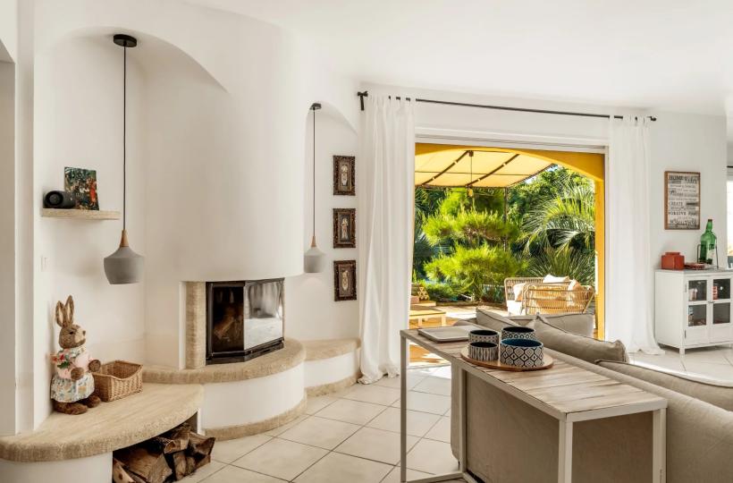 The ground floor opens onto a spacious, light-filled living room with a fireplace, an equipped kitchen that extends naturally to the terrace and garden, and a home office. The master suite, with dressing room and shower room, opens directly onto the garden, offering a peaceful view of the surrounding nature.