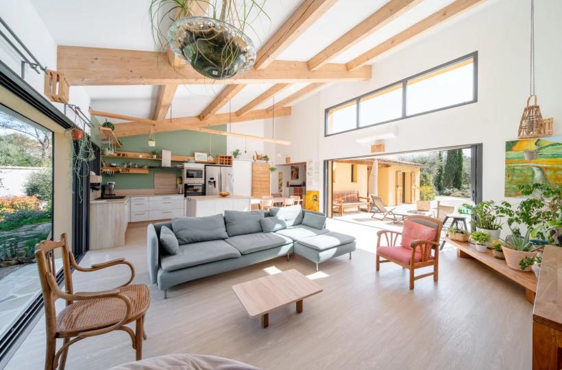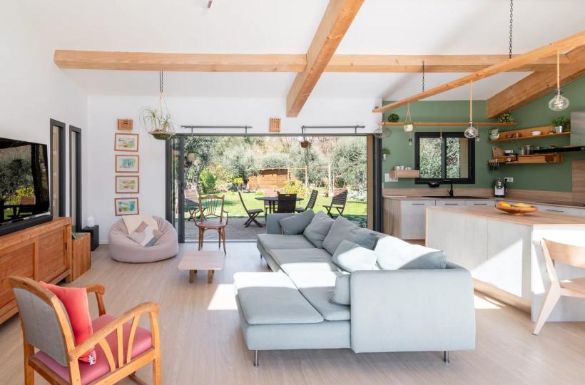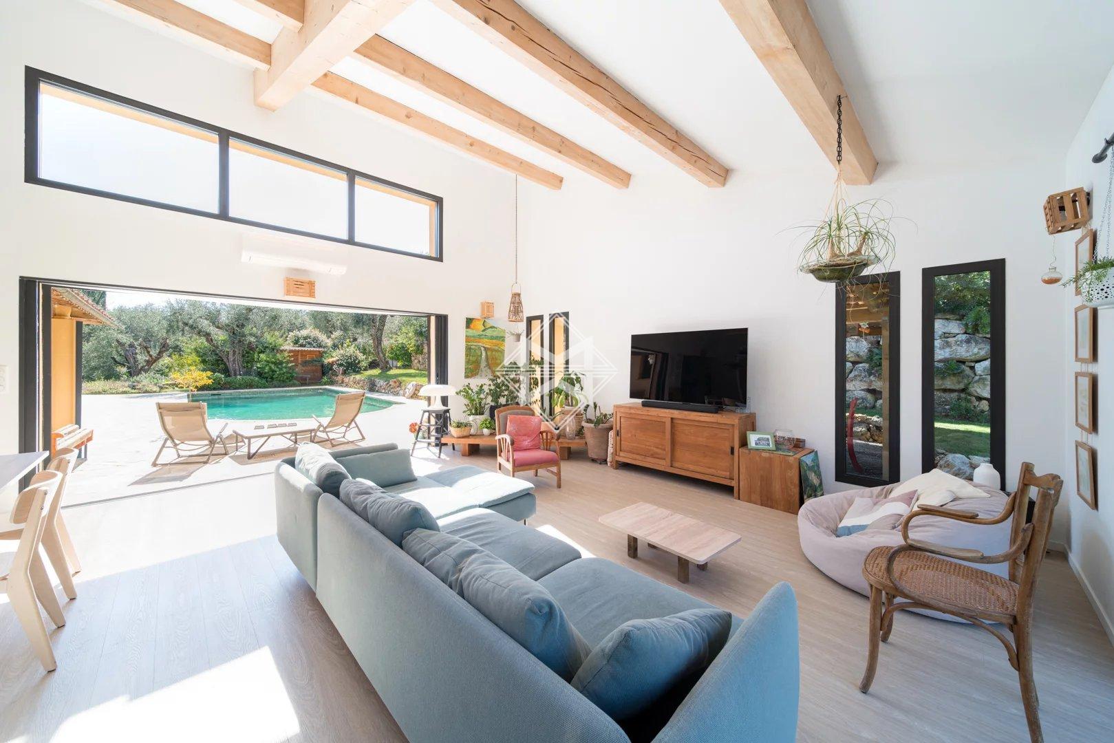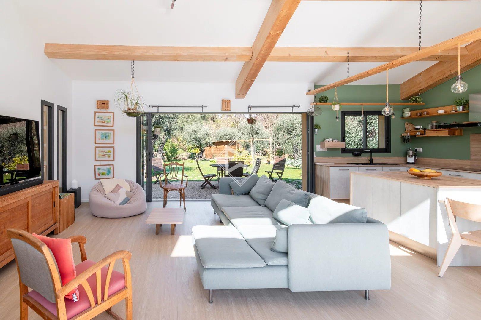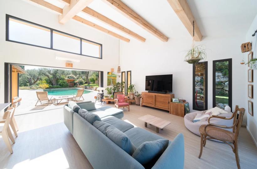 The bright living room is cross-ventilated thanks to large folding bay windows that open generously on one side towards the pool area and on the other towards a terrace extended by a charming landscaped garden.