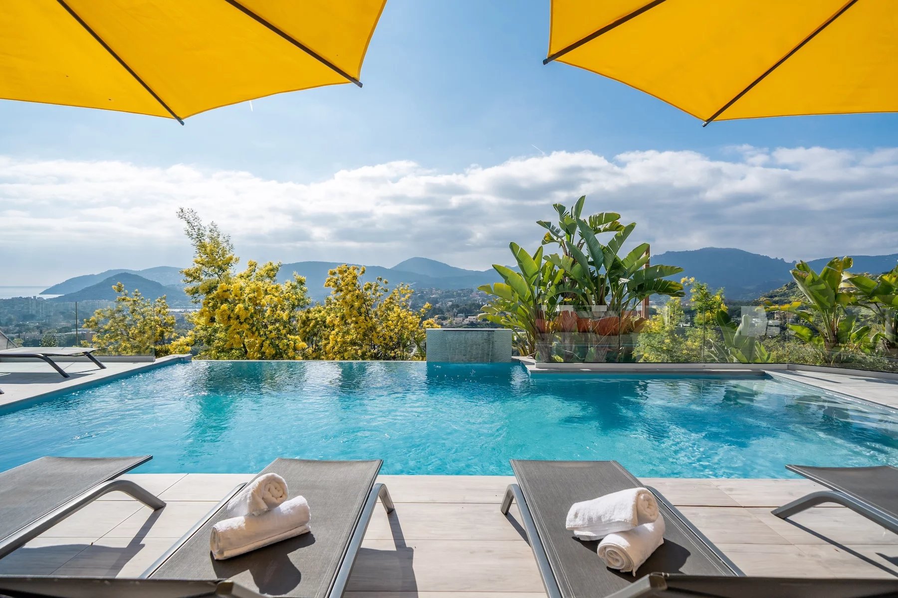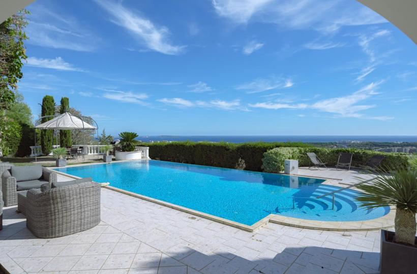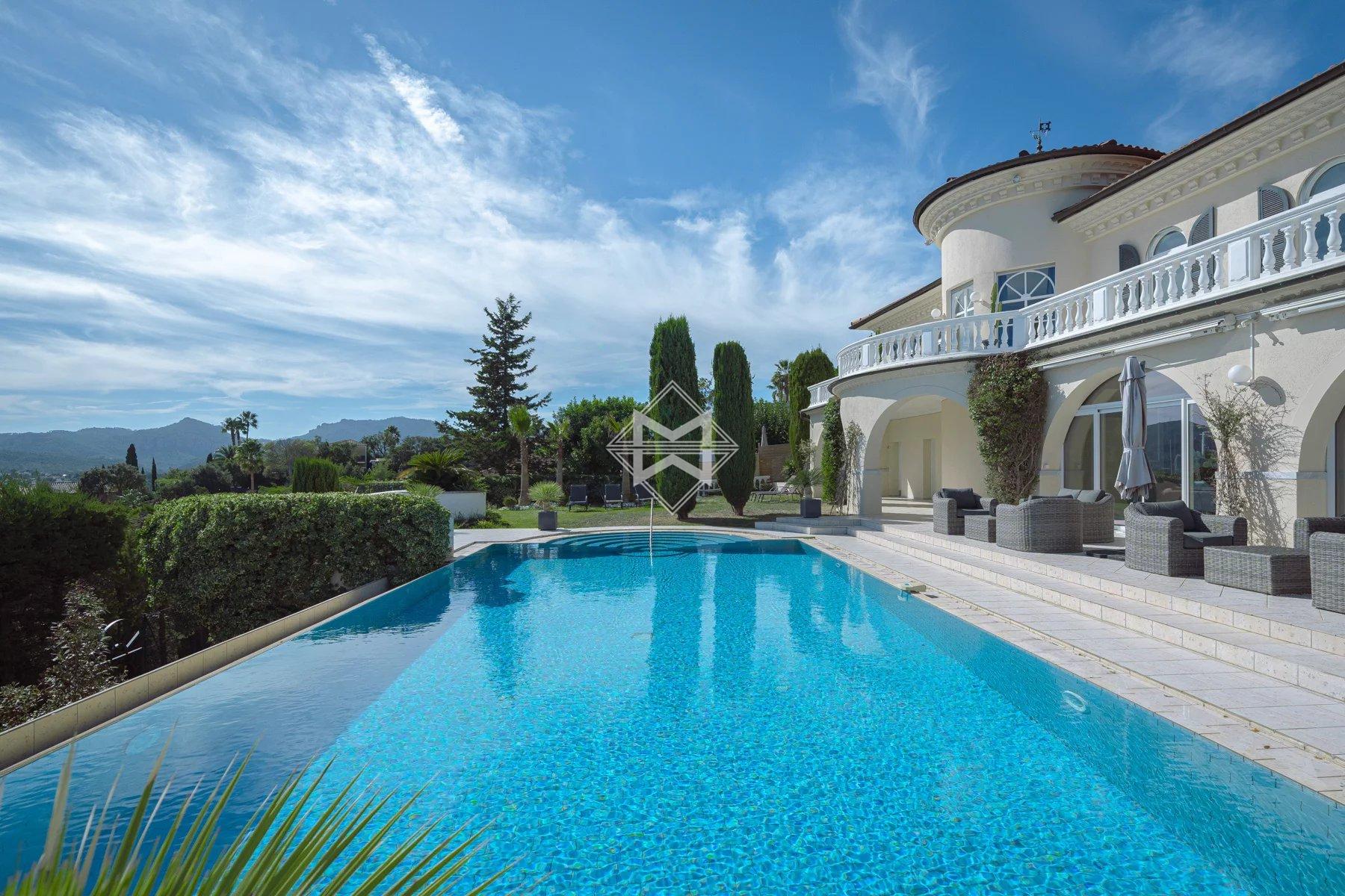 Perched on the heights of Mandelieu, this elegant villa offers breathtaking panoramic views over the Bay of Cannes while remaining just moments away from all amenities.