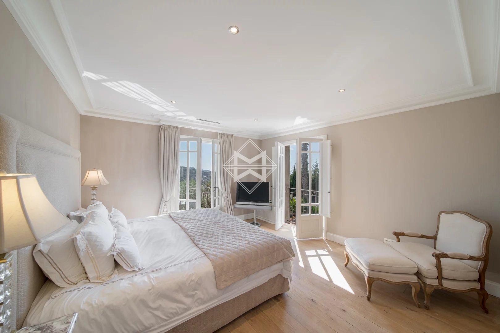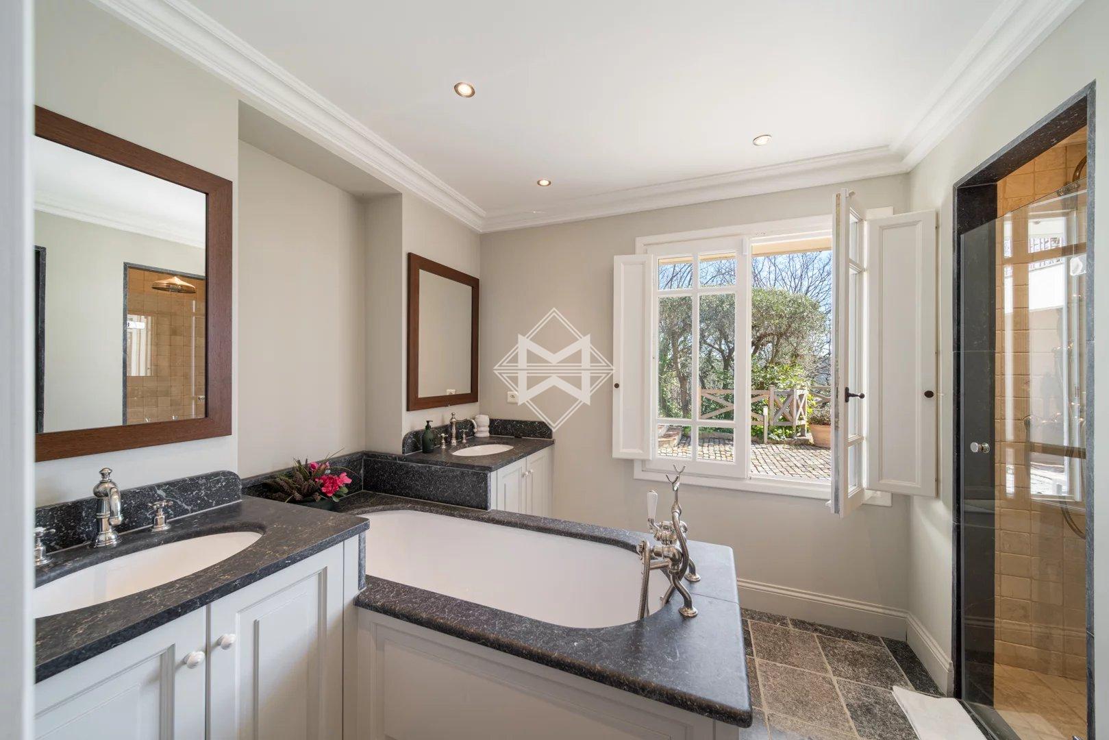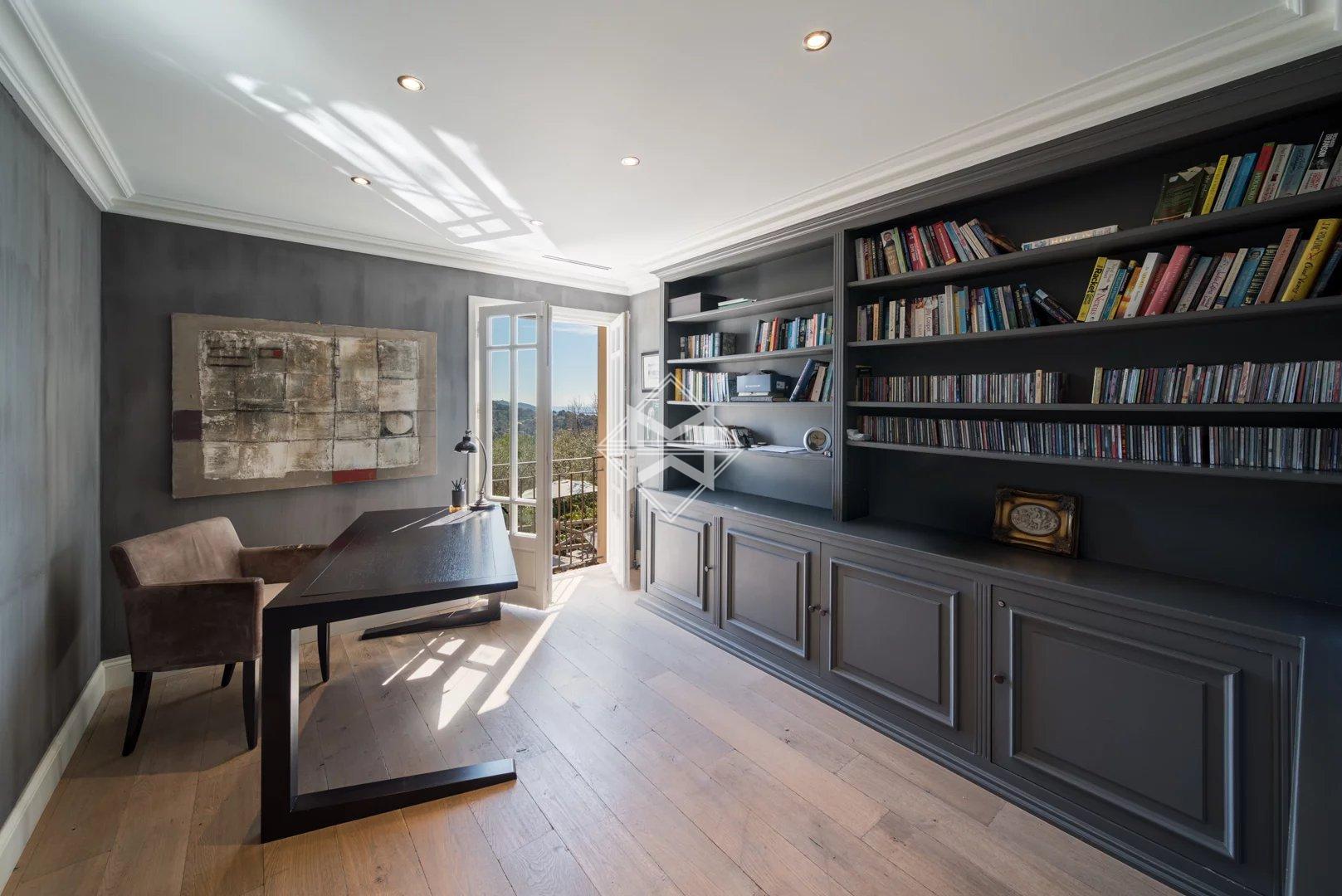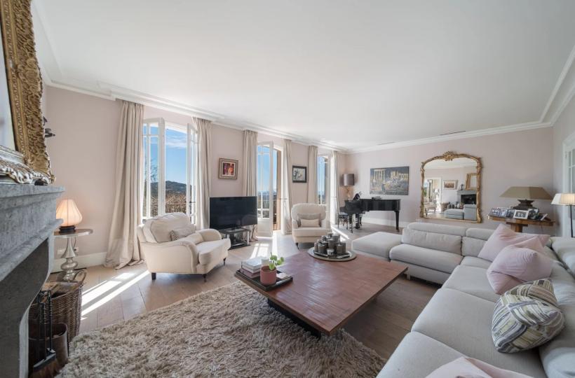 At the gateway to the old village of Mougins, this magnificent property of approximately 360 sqm, built over two levels, offers a rare living environment combining generous volumes, comfort and spectacular views over the bay of Cannes, the Alps and the village bell tower.