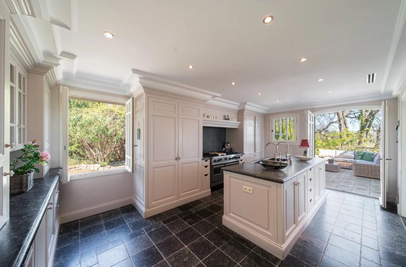 Set on beautifully landscaped grounds of approximately 2,400 sqm, the property features a heated saltwater swimming pool surrounded by large terraces, a summer kitchen, several outdoor relaxation areas, as well as indoor and outdoor parking.