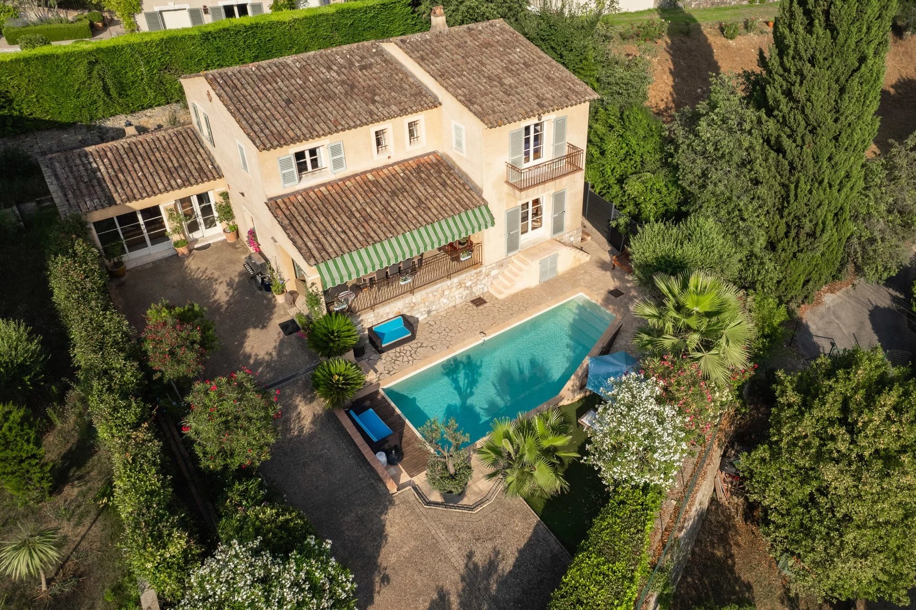 Outdoor lighting, a garage and several parking spaces complete this property, which combines charm, comfort and nature, ideal for a peaceful family life or an unforgettable vacation in the Valbonne sunshine.