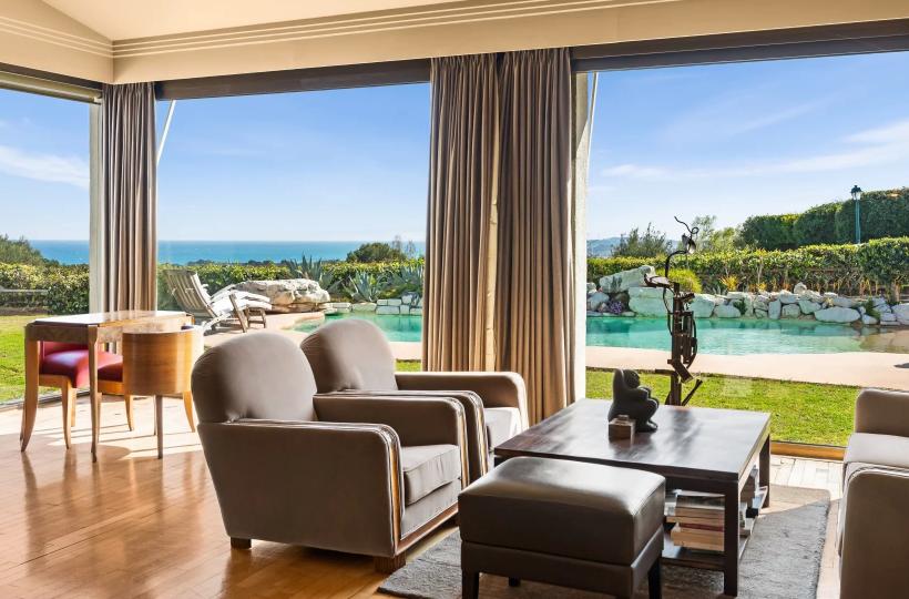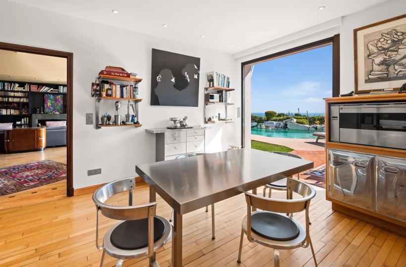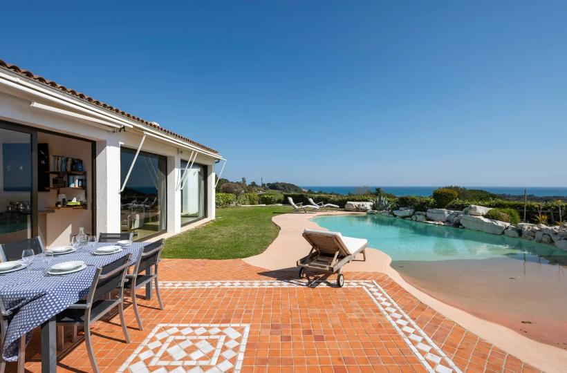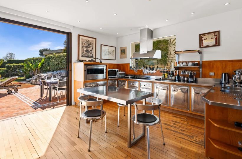 Facing south, the villa of approximately 288 sqm is arranged over two and a half levels. It opens onto an elegant reception room with cathedral ceiling, featuring a living room with fireplace and a dining area, both widely opening onto the garden and swimming pool with spectacular sea views. A fully equipped independent kitchen extends to the summer terrace and barbecue area through sliding pocket doors.