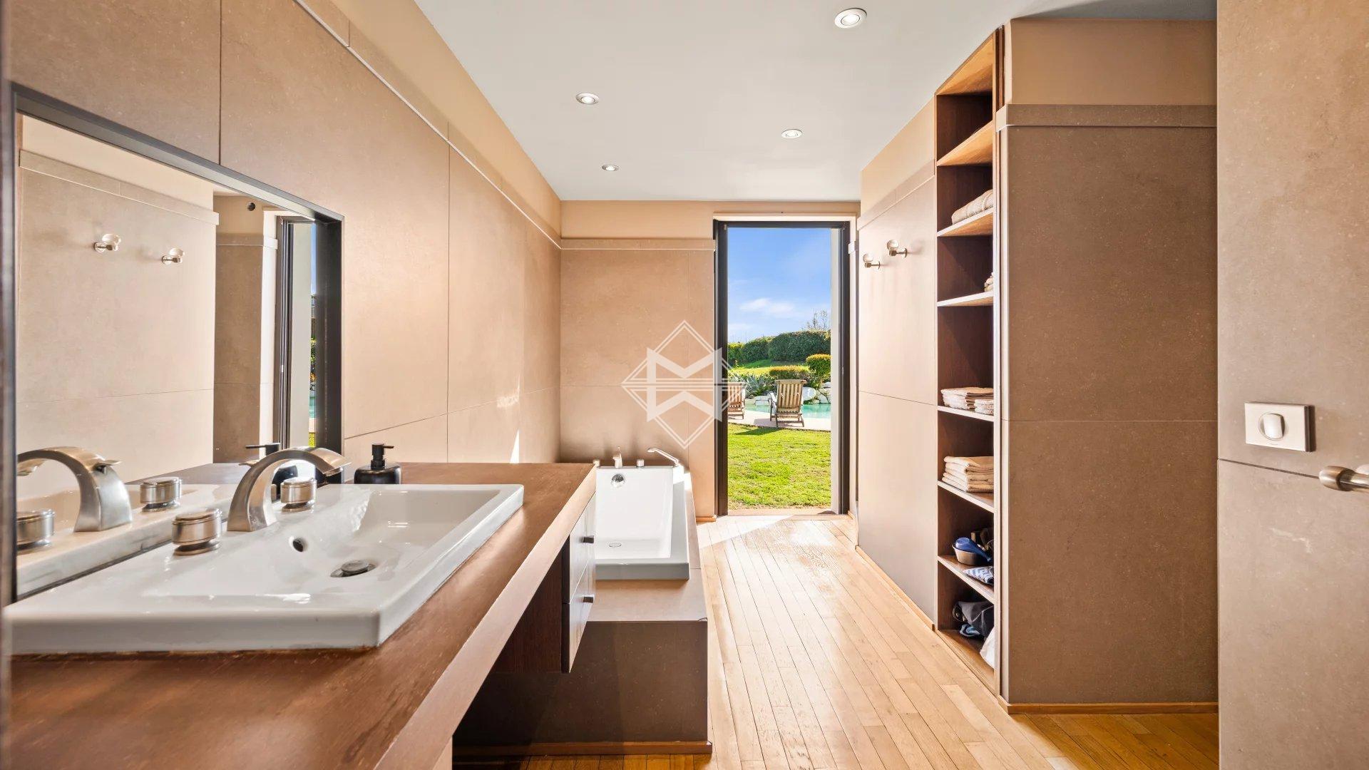 A remarkable staircase with wrought-iron railing originating from the legendary Palais de la Méditerranée leads to the upper level, which features a bedroom with bathroom and a Tropezian terrace. The garden level includes an en-suite bedroom with dressing room, a laundry room, a second dressing room and the pool technical room.